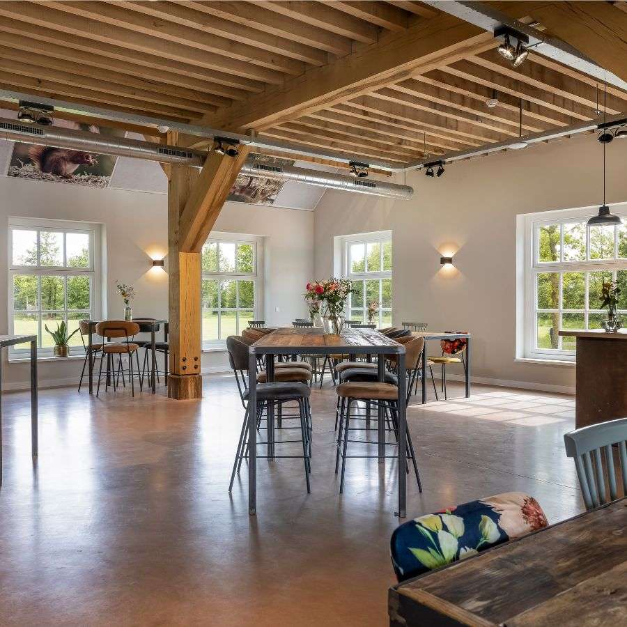 Ontdek de perfecte locatie voor jouw volgende personeelsfeest, familiefeest, jubileum, verjaardagsfeest, bedrijfsborrel, netwerkborrel, pensioenfeest, reünie of eindejaarsborrel bij de Reuselhoeve en Weidehoeve! Ook bij minder goed weer of in het najaar/winter ben je bij ons van harte welkom. Onze sfeervolle boerderij combineert eigentijdse flair met klassieke charme: grote eikenhouten balken roepen het gevoel op van vroegere boerderijen, terwijl strakke vloeren en stoere meubels met metalen accenten een eigentijdse uitstraling geven. Kom gerust eens langs en ontdek het zelf!