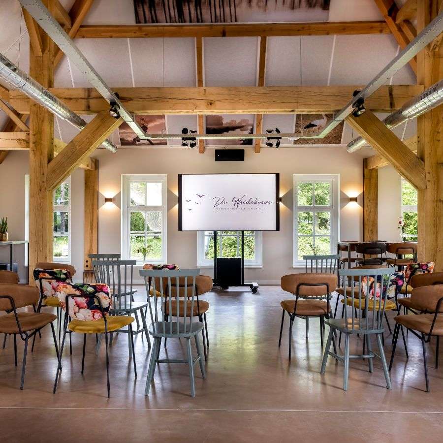 - De Weidezaal: met een eigen bar en een ruimtelijke vide is dit de plek waar gezelligheid samenkomt. De weidezaal biedt ook plaats aan ongeveer 70 personen.